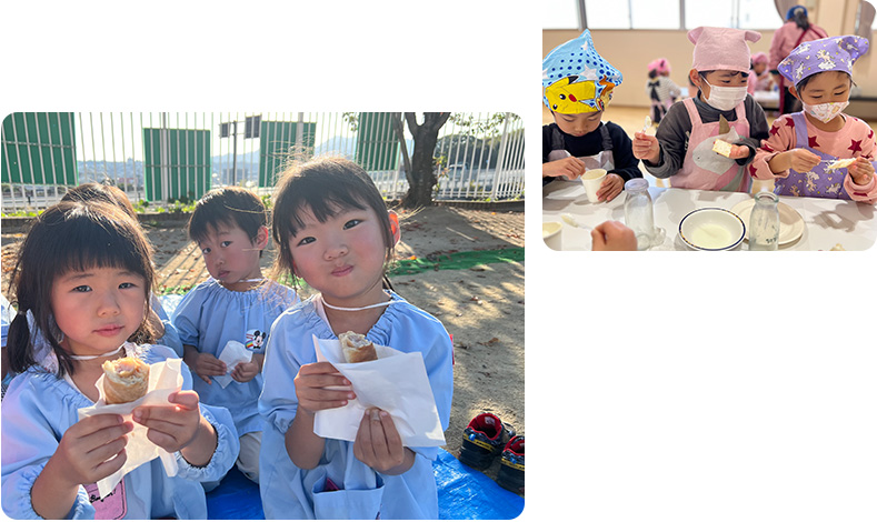 ドーナツ、お団子、おかき、フルーツポンチ、お好み焼きなど、種類も充実。特に人気の手作りパンの日は調理室から取ってもいい匂いが園内に広がります。