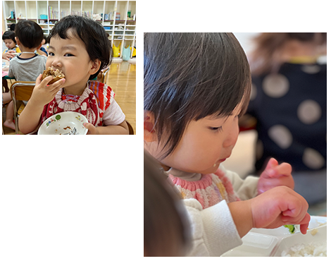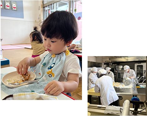 栄養士による栄養管理のもと、地元の食材をたくさん使った季節を感じられる安心で安全な献立で、子ども達の心と体の成長をサポートすることを心がけています。園内調理による完全給食なので、毎日、出来立てのおいしい給食と炊き立ての白米を提供しています。